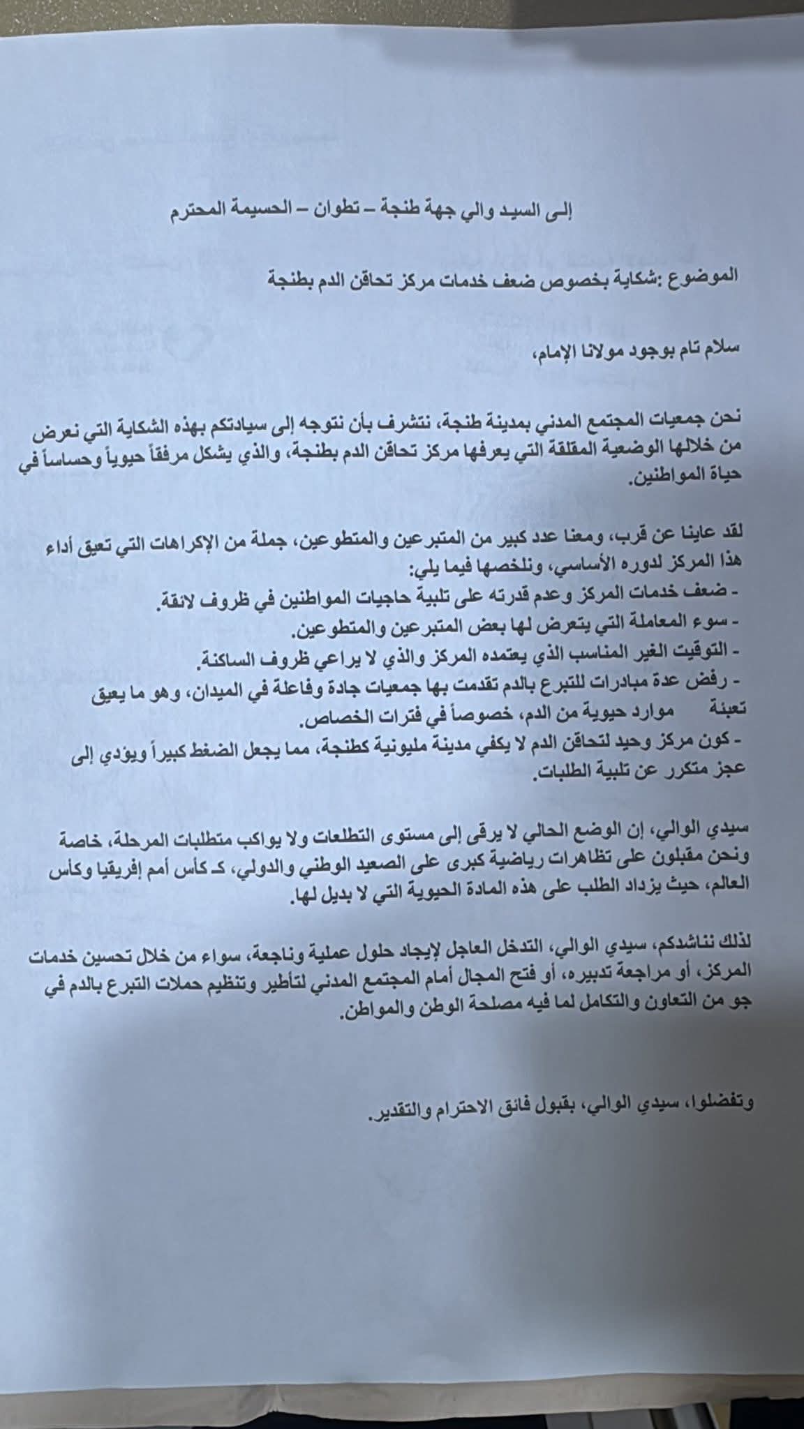 فعاليات جمعوية تتقدم بشكاية إلى والي جهة طنجة حول ضعف خدمات مركز تحاقن الدم.
